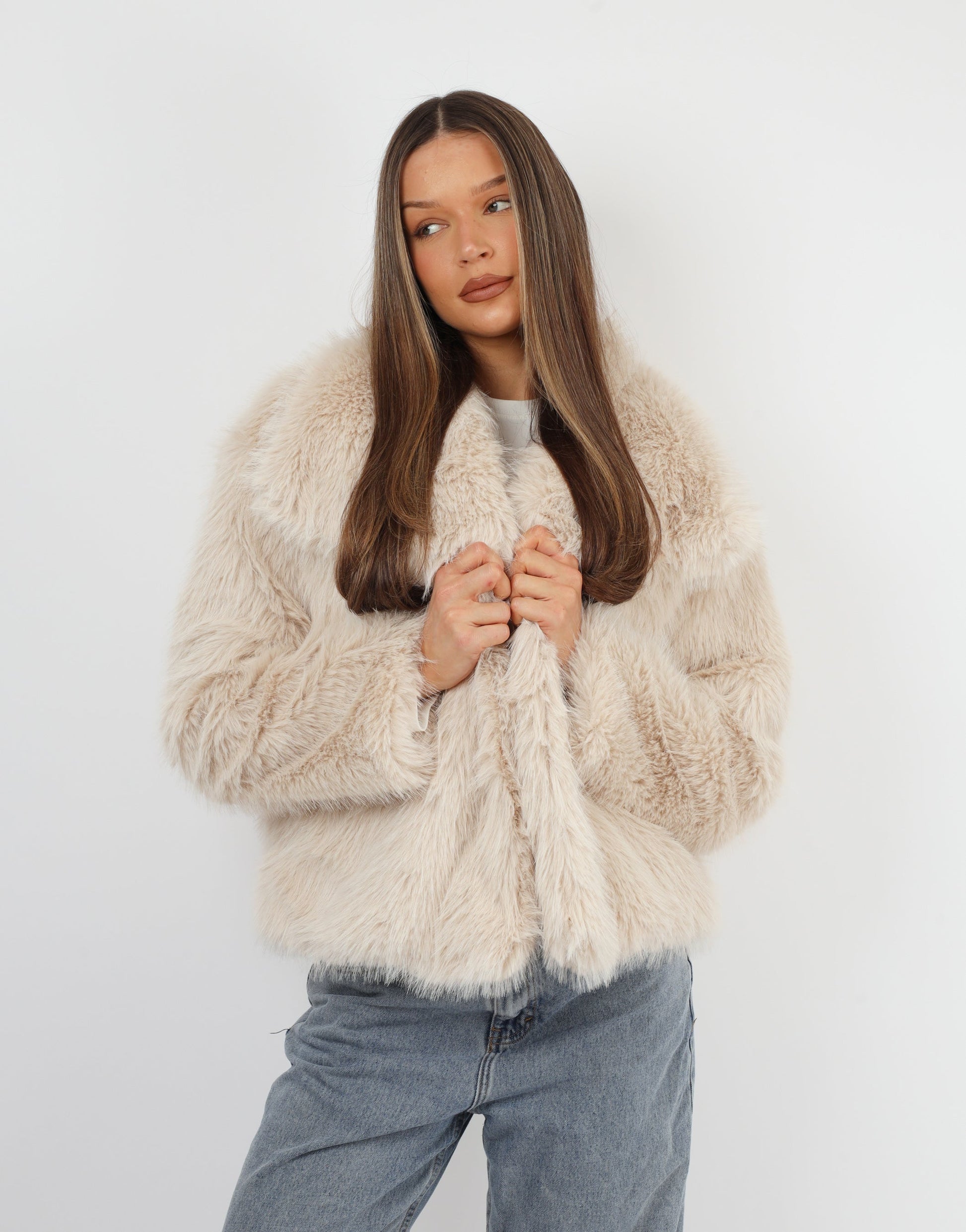 Arabella Oversized Collar Premium Faux Fur Coat in Beige