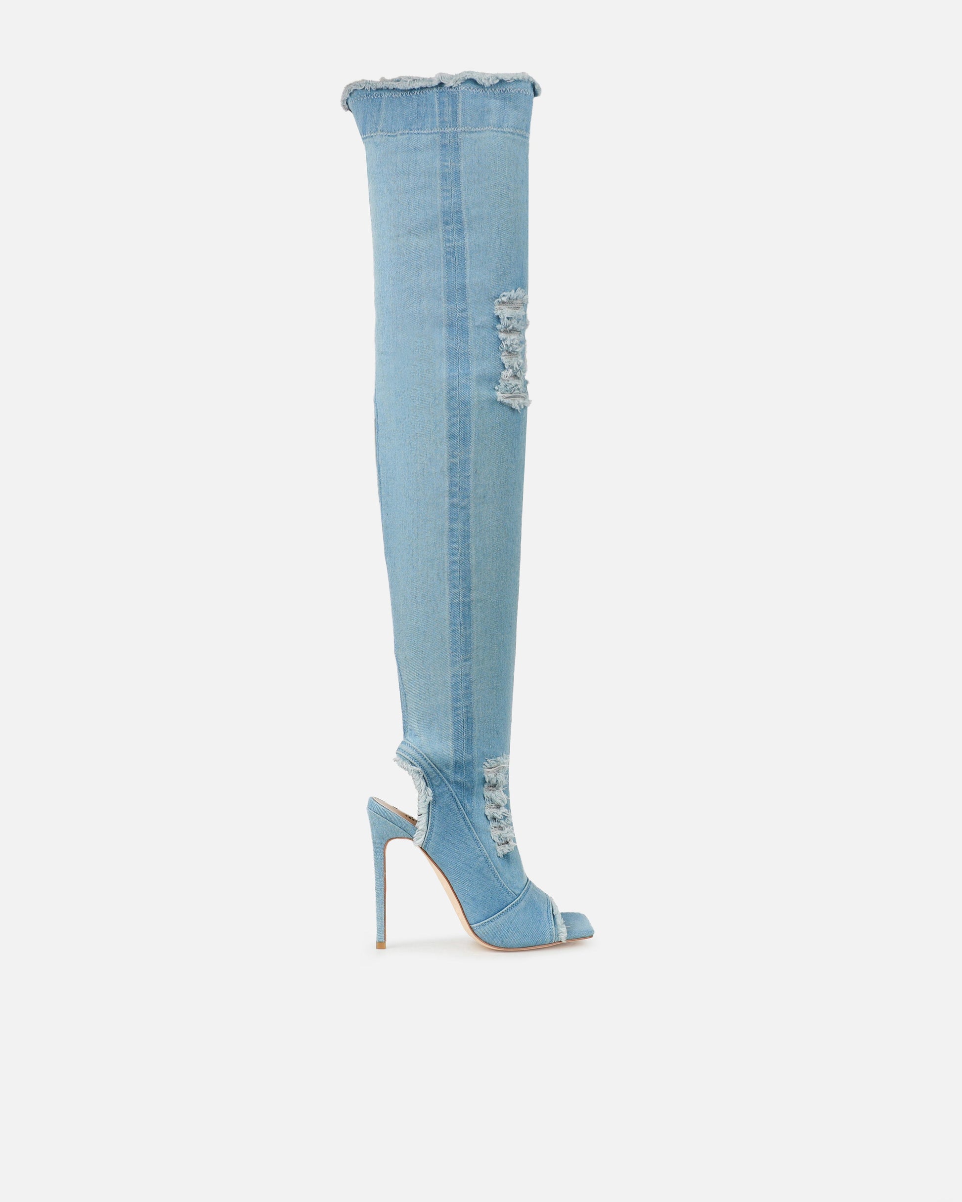 Dimitri Blue Denim Open Toe Stiletto Thigh High Boots