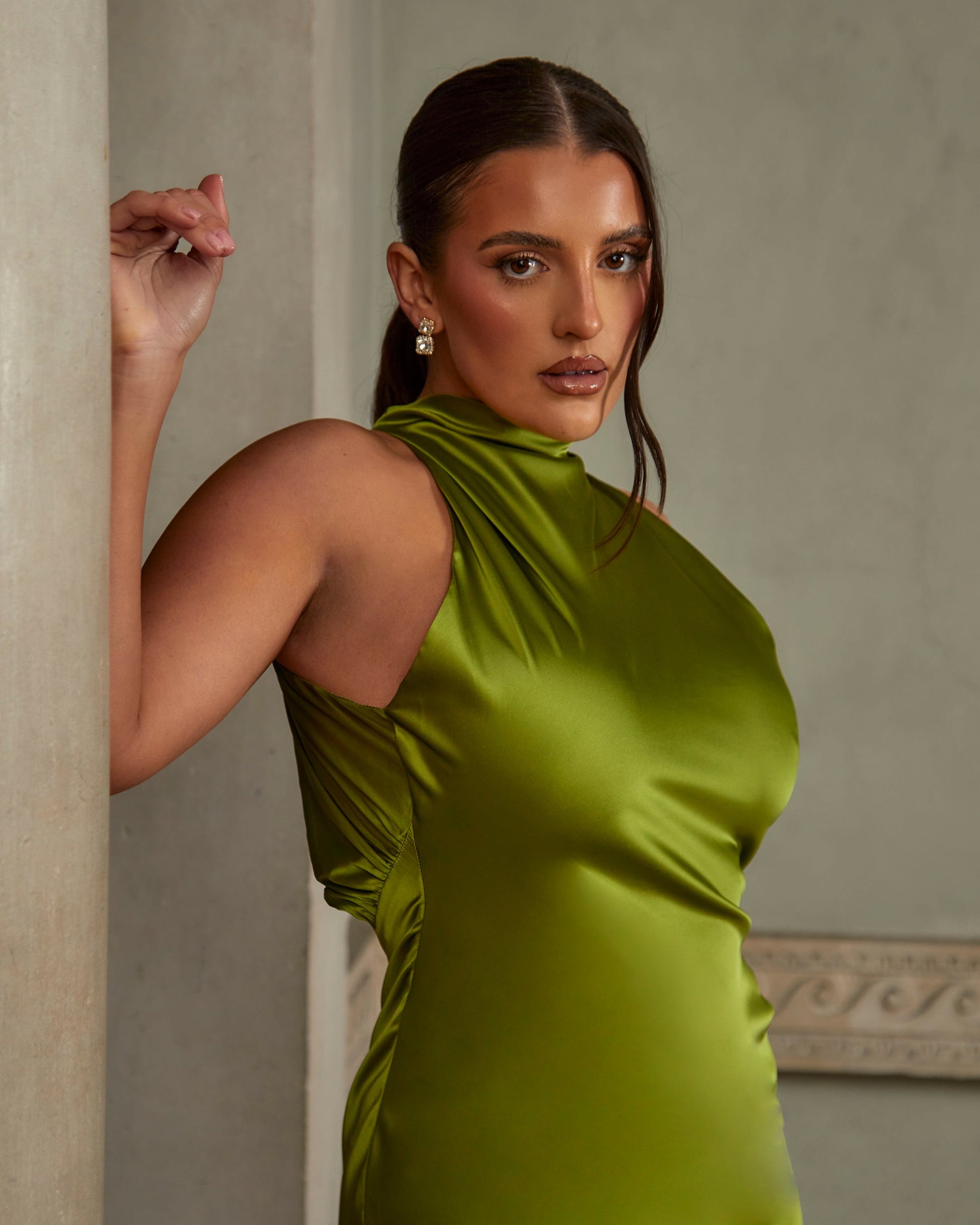 Dionne Crowe Everlasting Green High Cowl Neck Plunge Back Midaxi Dress