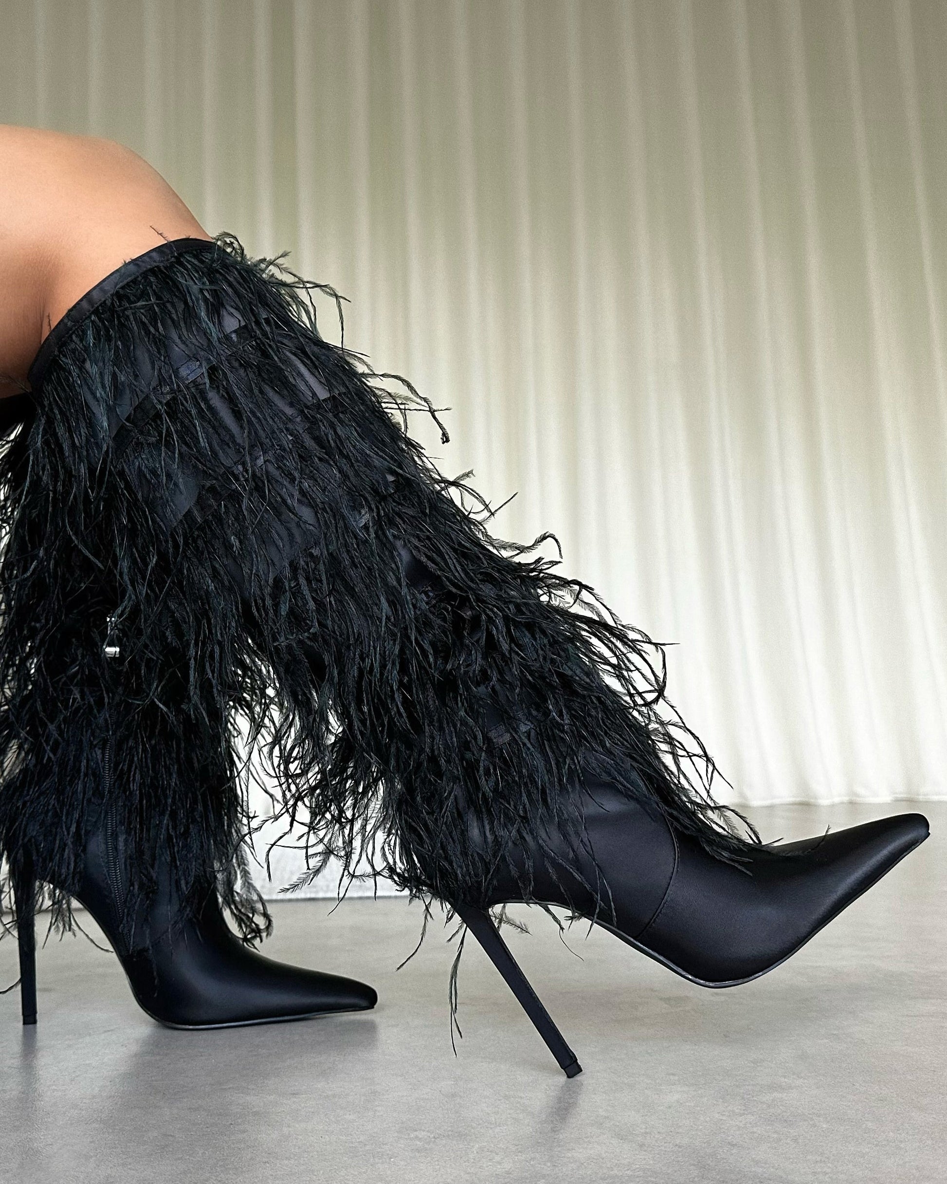 Marcos Black Satin Fluffy Stiletto Knee High Boots